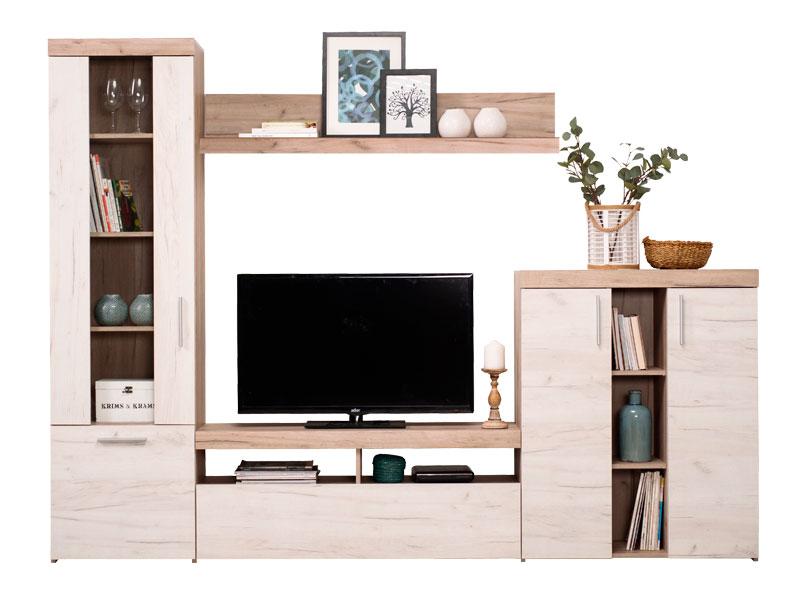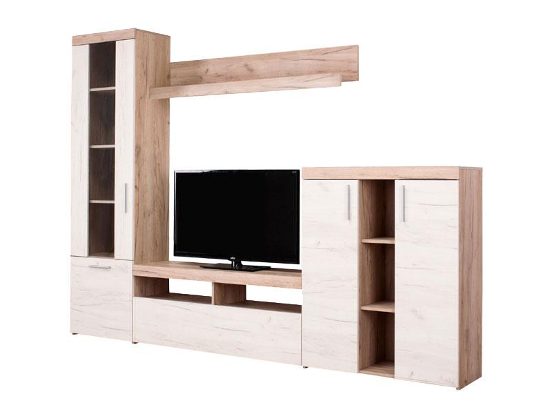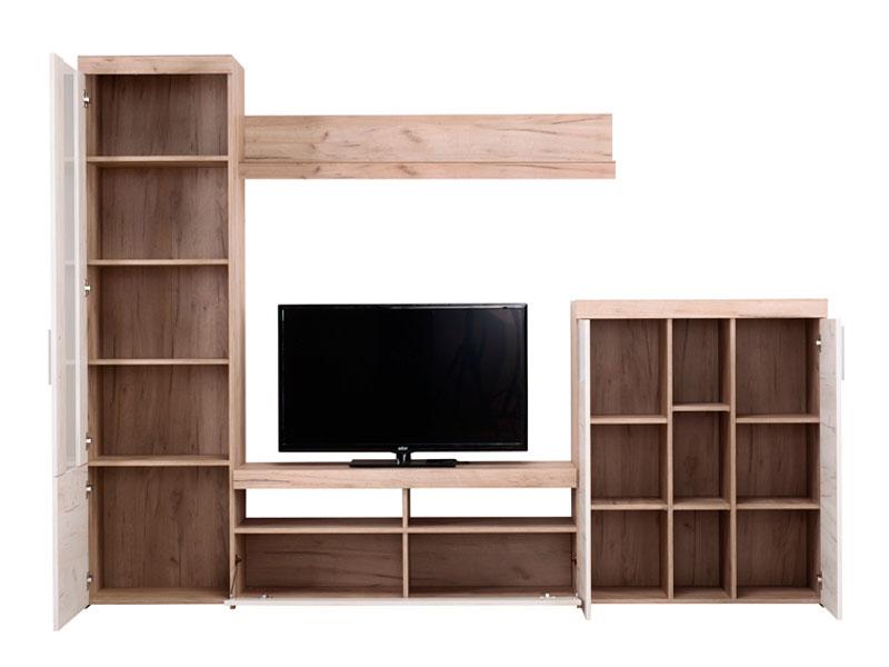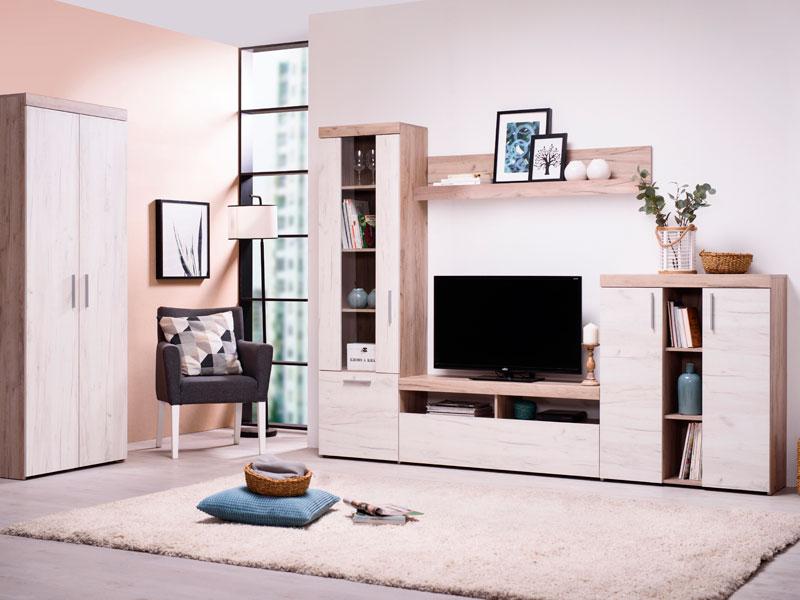 Regal u kombinaciji dekora sivog i bijelog hrasta, karakteriše dizajn čistih linija i bogate teksture, kao i skladna kombinacija elemenata sa poluotvorenim, zastakljenim i otvorenim riješenjima. Zahvaljujući unapređenoj funkcionalnosti upotrebnog prostora i toploj koloritnoj šemi ovaj model regala stvorit će idealan dnevni boravak prepun dragih uspomena, knjiga i dekoracije.