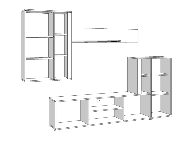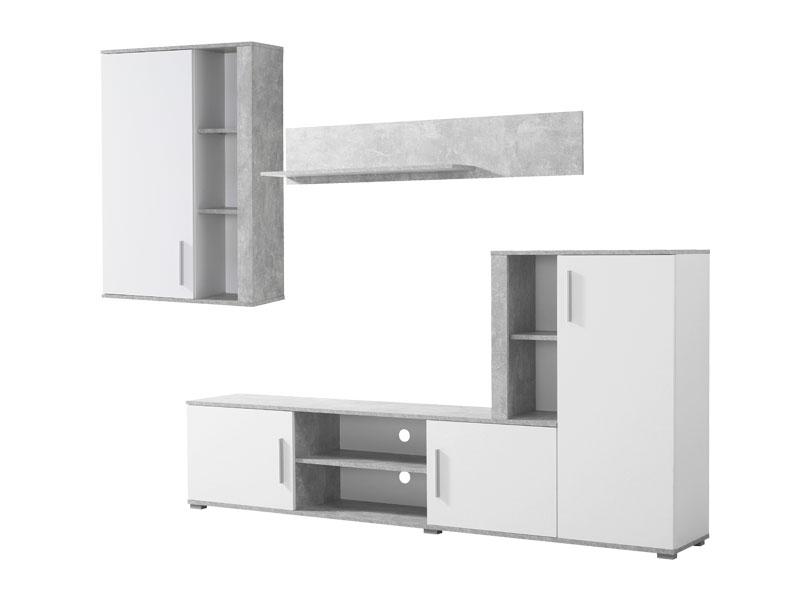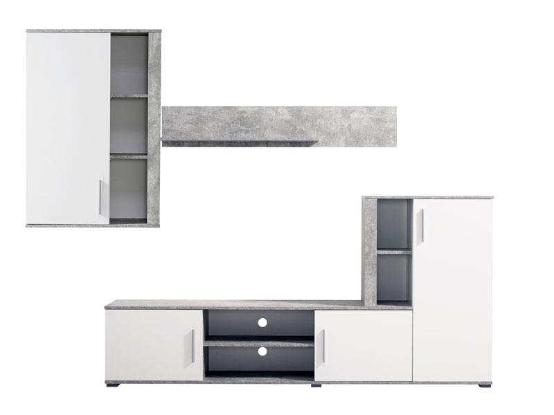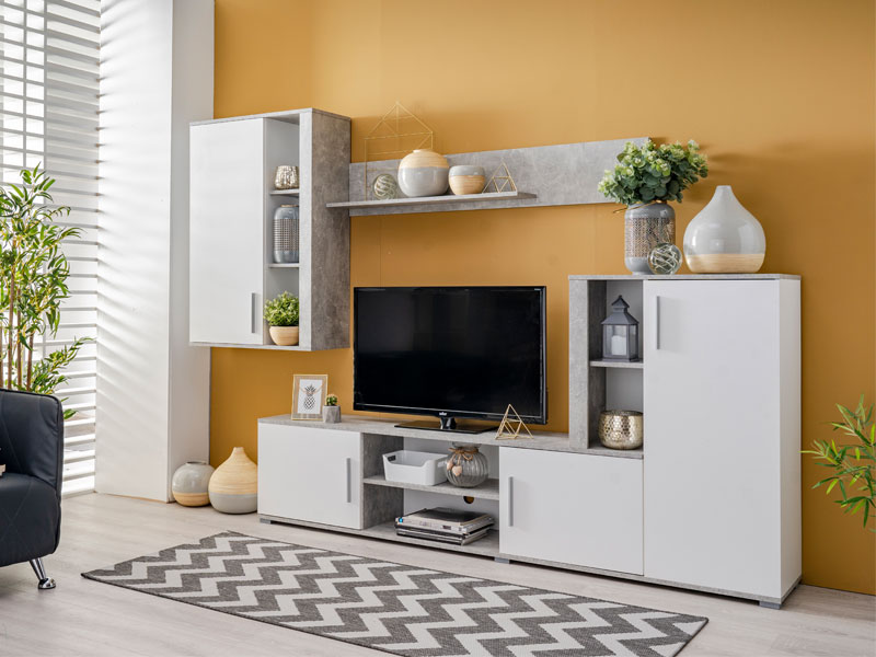 Regal PARMA, u beton i opak bijelom dezenu, omogućava kompletno opremanje dnevnog boravka, zahvaljujući izuzetno praktičnom rasporedu otvorenih i zatvorenih polica. Dizajn regala pruža mogućnost pozicioniranja u prostoru različitih dimenzija, zahvaljujući odvojenim cjelinama elemenata.