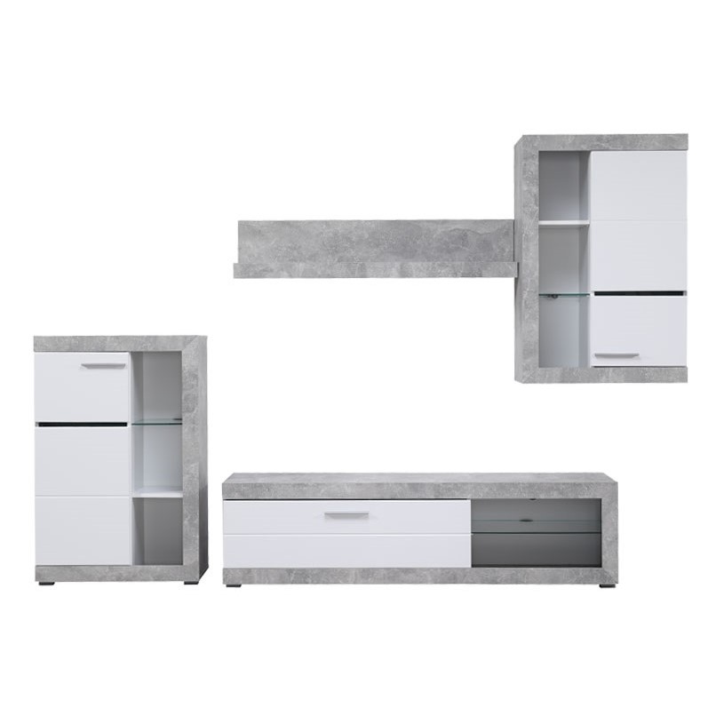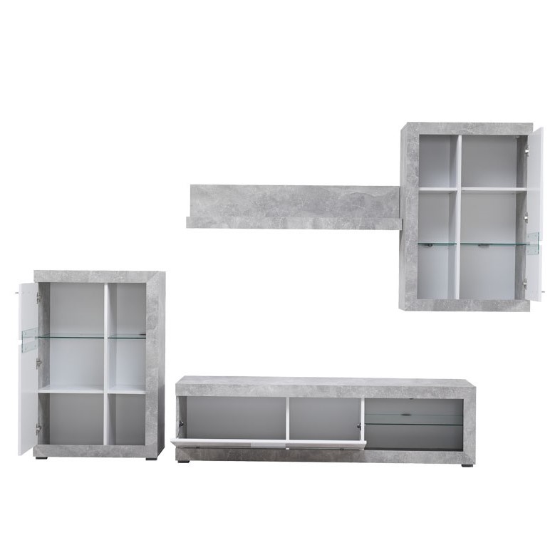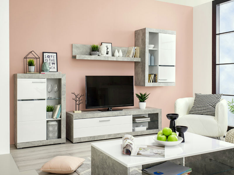Regal - u kombinaciji beton dekora i opak bijele, sa frontovima presvučenim bijelom 3D MDF lak folijom, dizajniran je da zadovolji funkcionalne i estetske zahtjeve u uređenju svakog ambijenta. Regal omogućava kompletno opremanje dnevnog boravka, zahvaljujući izuzetno praktičnom rasporedu otvorenih i zatvorenih polica. Postoji mogućnost dodavanja LED rasvjete.