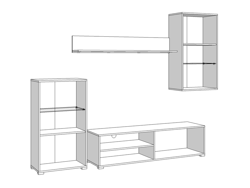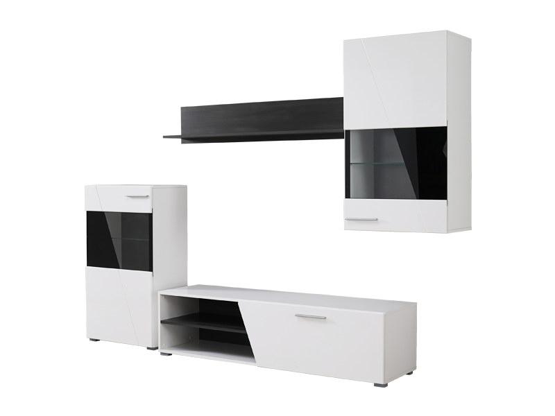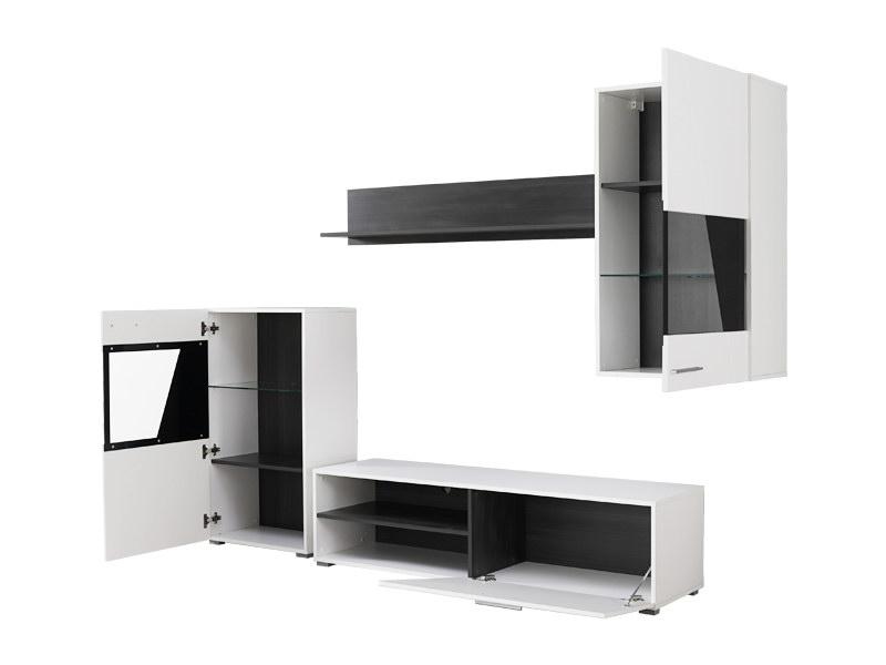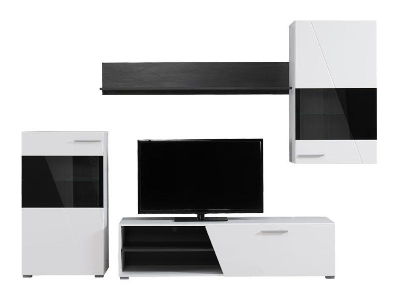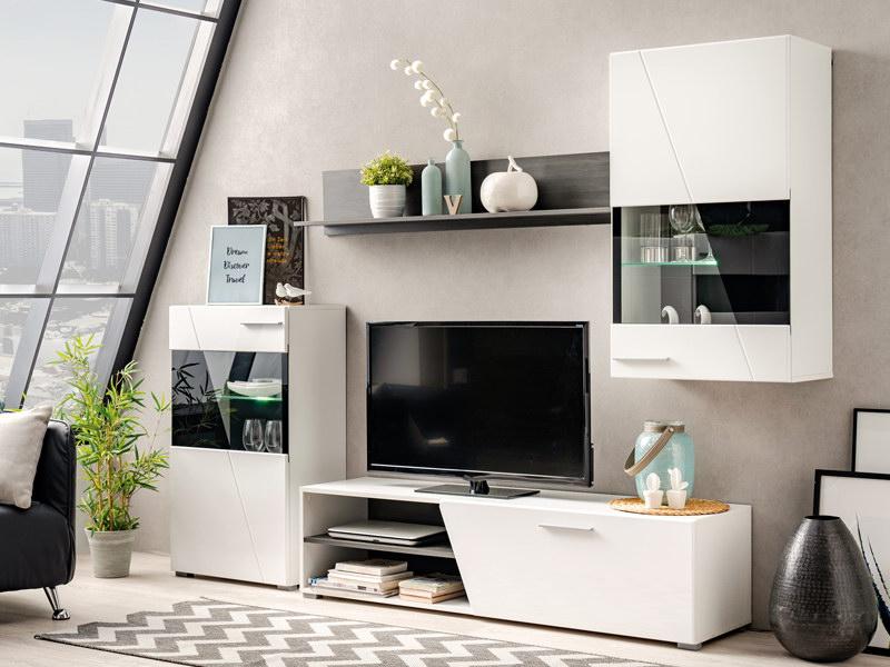 Regal - sastavljen od segmenata koje čine TV polica, vitrina i zidna polica, u kombinaciji bijele lak folije i crnog drveta, sa poluzastakljenim elementima, vašem domu dat će potpuno nov, futuristički izgled. Regal možete dodatno opremiti LED rasvjetom.