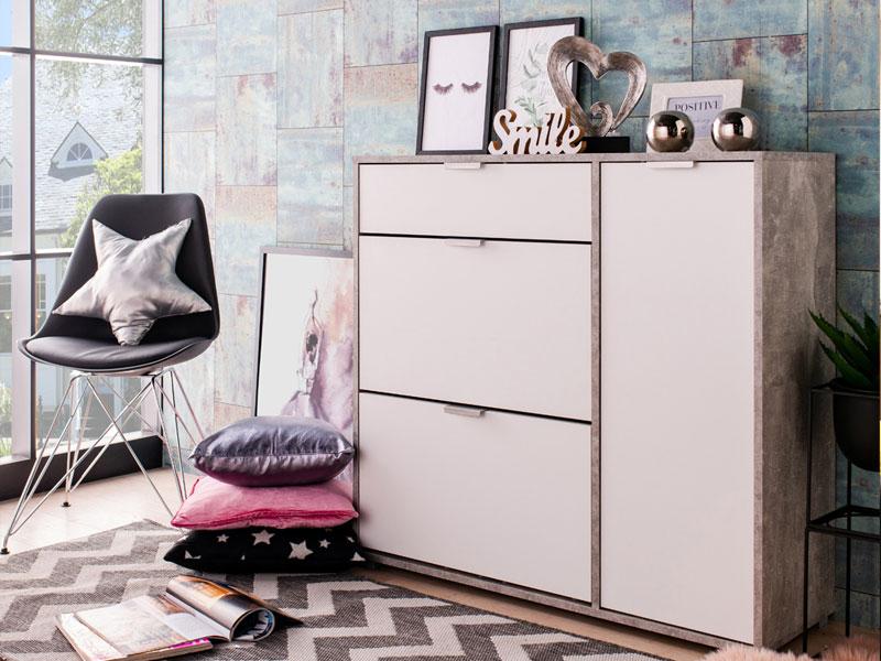 Cipelar u opak bijelom dezenu, idealno je rešenje za uklapanje u prostore različitih dimenzija. Ovaj model posjeduje dva segmenta za odlaganje obuće, praktičnu fioku i desno pozicioniran dio sa dvije police.