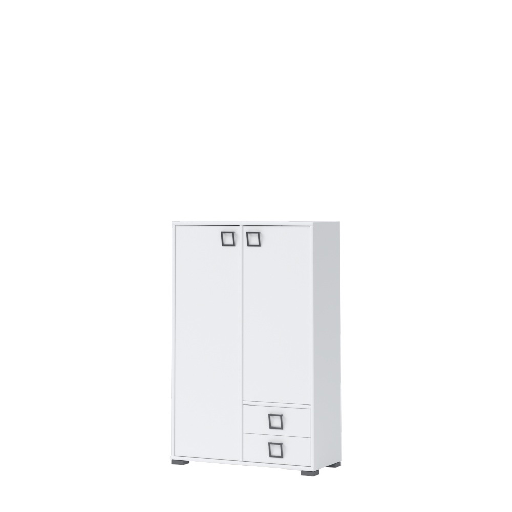 Komoda za dječiju sobu sa dva krila i dvije fioke. Raspored krila se može mijenjati, a zavisno od pozicije kraćeg krila, fioke se mogu montirati u uglovima pa ovaj element može imati četiri različita izgleda