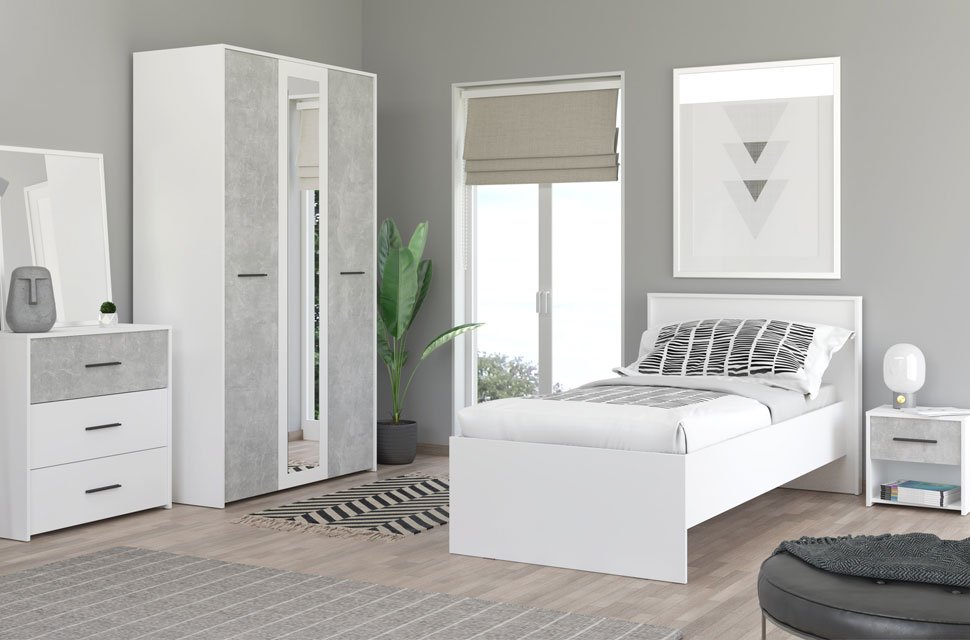 Noćni ormarić u dekoru opak bijele i betona, dio je istoimene kolekcije elemenata spavaće/dječije sobe. Idealna je dopuna spavaćem krevetu i doprinosi praktičnom uređenju ambijenta.