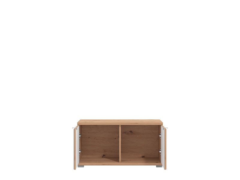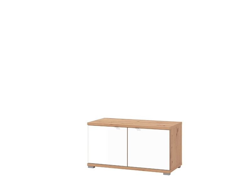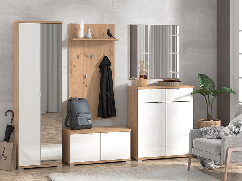 Element predsoblja u kombinaciji artisan hrasta i bijelog bojenog stakla, unijet će u vaše predsoblje svježinu i eleganciju. Frontovi su obogaćeni diskretnim sivim ručicama jednostavnog dizajna, a koje su usklađene sa dizajnerskom linijom cijele kolekcije. Posjeduje praktičan zatvoreni segment za odlaganje obuće.
