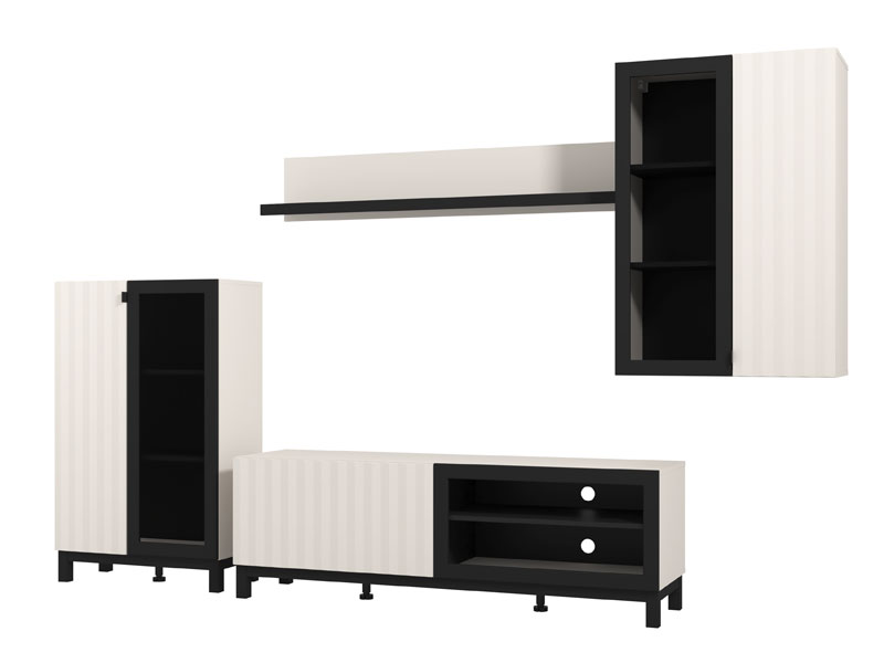 Regal u kombinaciji kašmir dekora, kašmir folije, crne i crne mat folije, dizajniran je da zadovolji funkcionalne i estetske zahtjeve u uređenju dnevne sobe.