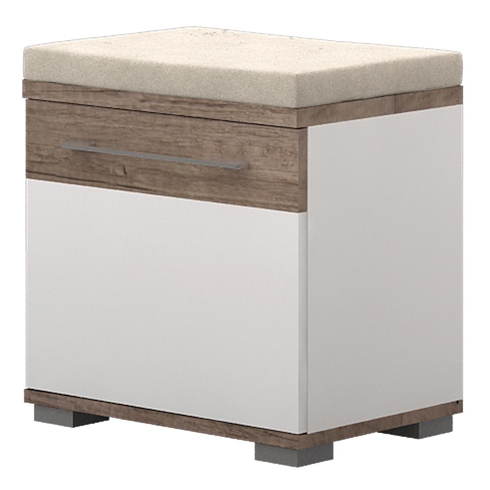 Praktična komoda sa tapaciranim jastukom za sedenje i jednim krilom sa gasnim amortizerom daće vašem prostoru na funkcionalnosti. Plafon elementa je debljine 25mm, a pod 18mm, od univera u drvo dekoru Tamna Nebraska, dok je ostatak korpusa u beloj boji sa teksturom drveta debljine 18mm. Front elementa je od univera u belom drvo dekoru debljine 18mm sa aplkacijom u dekoru Tamna Nebraska. Sadrži jedan fah. Korpus elementa je kantovan i sa zadnje strane. Hromirana ručica i podesive nožice uračunate su u cenu elementa, kao i mekani jastuk na gornjem delu, koji pruža dodatnu udobnost prilikom obuvanja. Tapacirani jastuk je od sundjera debljine 5cm, a tkanina od kvalitetnog materijala, gustog tkanja. Sastav tkanine je vodootporan i omogućuje lakše odstranjivanje fleka.
