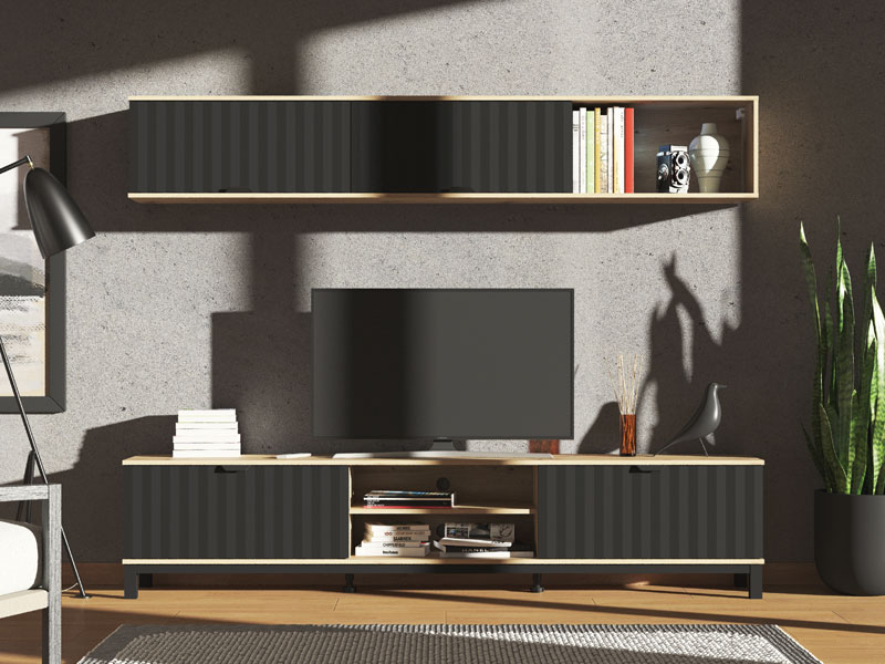 Regal u kombinaciji dekora artisan hrasta, artisan hrasta sa prugama, crne mat folije i crnog dekora dizajniran je da zadovolji funkcionalne i estetske zahteve u uređenju ambijenta dnevnog boravka. Regal MONACO omogućava praktično opremanje dnevnog boravka, zahvaljujući upotrebnom prostoru koji čine kako otvorene, tako i zatvorene police za odlaganje, kao i prostor predviđen za TV uređaj i ostalu audio-vizuelnu opremu. Prostor za TV je : 217x40 cm.