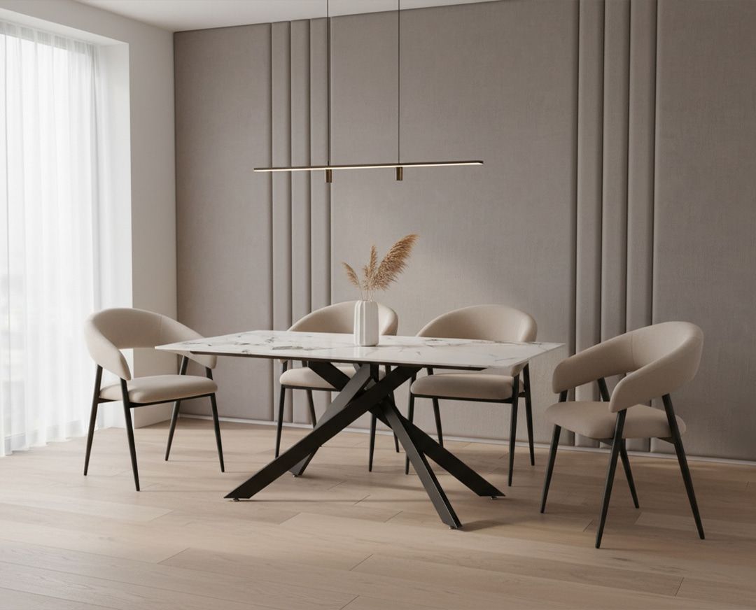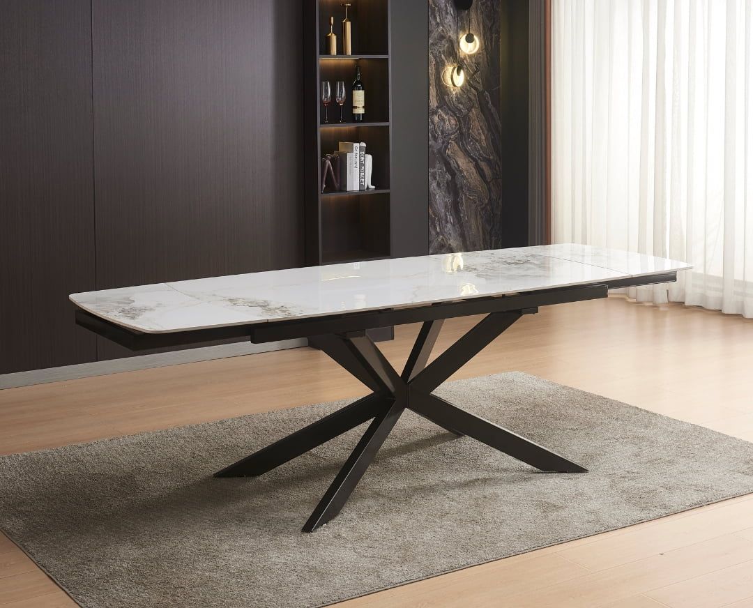 Dimenzije (šxdxv): 160-237x90x76 cm Boja: bijeli mramor, crne noge Materijali: ploča sinterovani kamen, metalni nogari