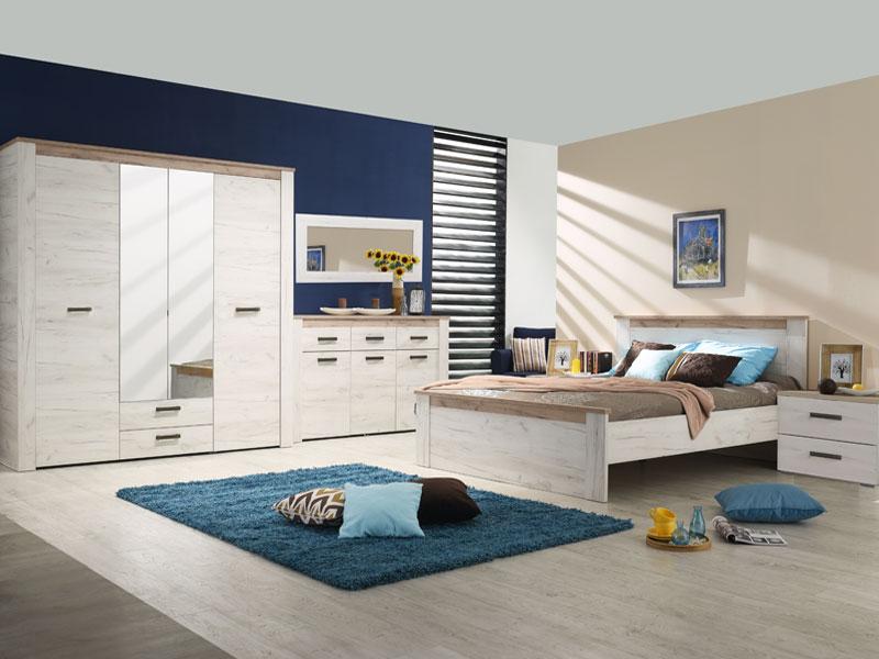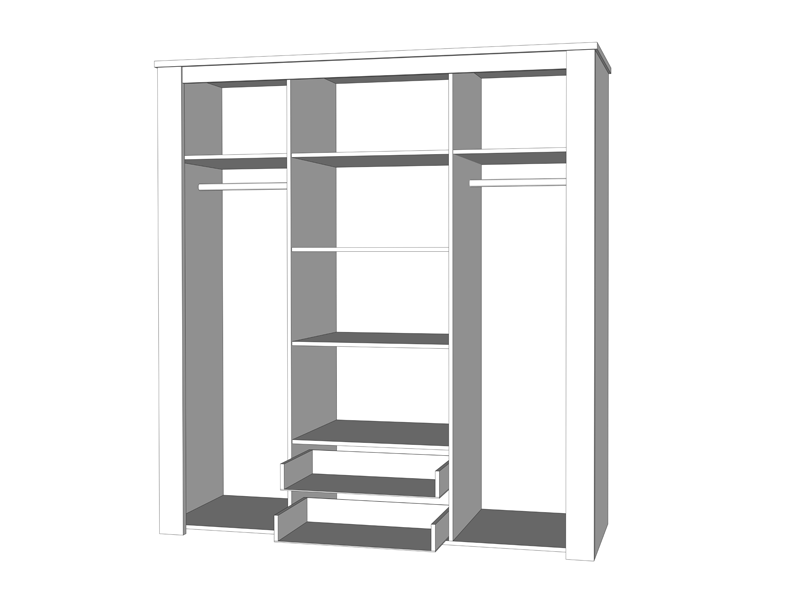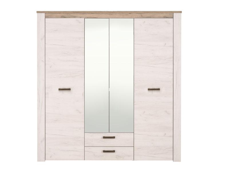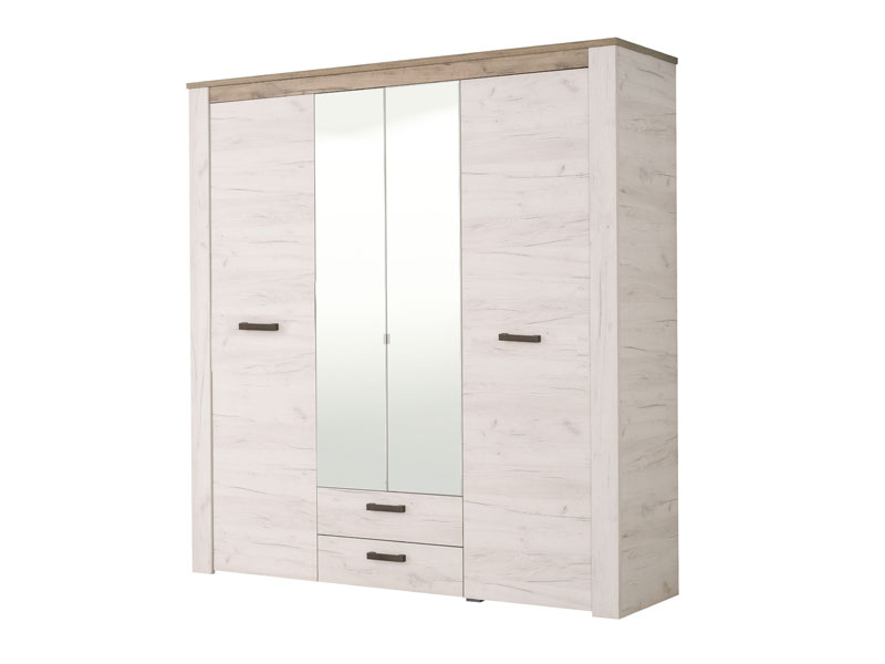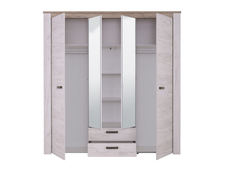 Ormar u kombinaciji dezena bijelog i sivog hrasta. Ovaj model posjeduje segment sa policama centralno pozicioniran, dijelove sa garderobnim šipkama i dvije praktične fioke.