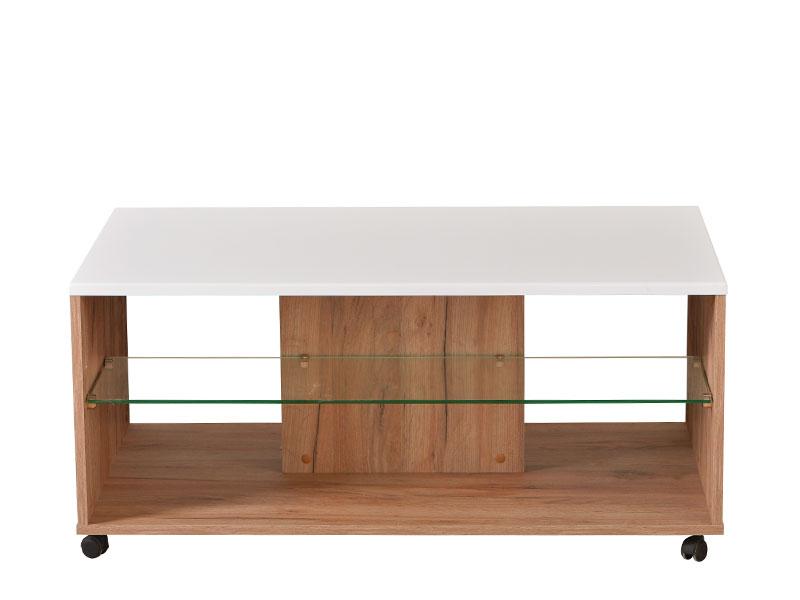 Klub stol BERT, u dekoru zlatnog hrasta sa bijelom lak folijom, posjeduje praktične i estetske efektne staklene police ispod radne površine pogodne za odlaganje omiljenih knjiga ili časopisa. Klub stol BERT doprinosi savremenom tematskom konceptu uređenja dnevnog boravka.