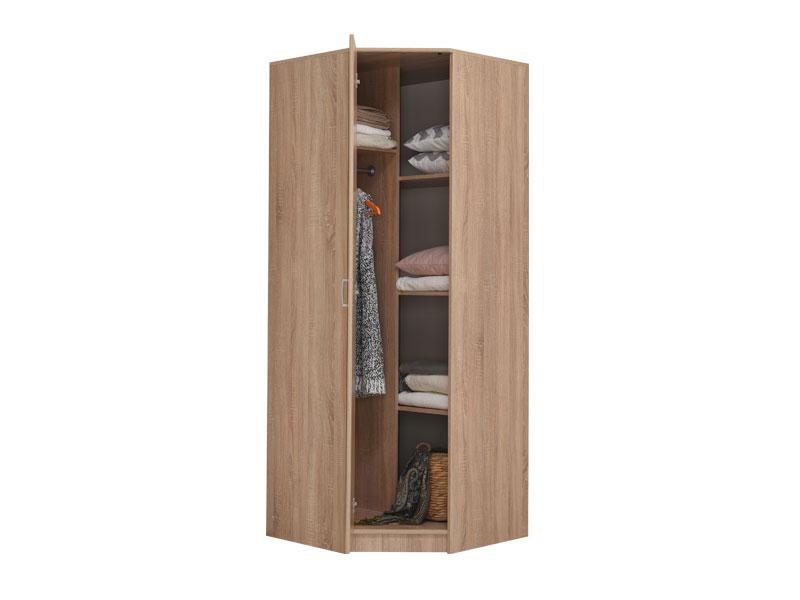 Funkcionalni model ormara u sonoma hrast dezenu, efektno racionalizuje ugaoni prostor u interijeru namijenjen odlaganju odjeće. Uspješno organiziran prostor ormara sastoji se od polica i garderobne šipke.