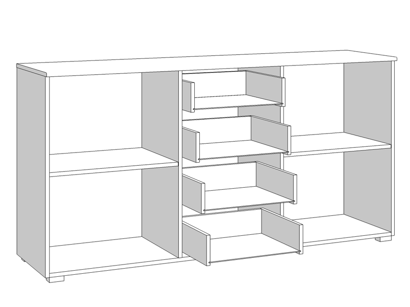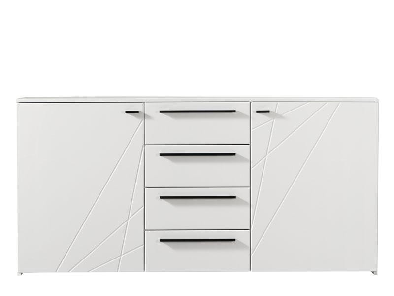 Komoda u opak bijelom dezenu sa frontovima presvučenim bijelom 3D MDF lak folijom, dio je kolekcije elemenata spavaće sobe. Komoda posjeduje bočne segmente sa pregradnom policom i četiri funkcionalne fioke, smještene u centralnom dijelu.