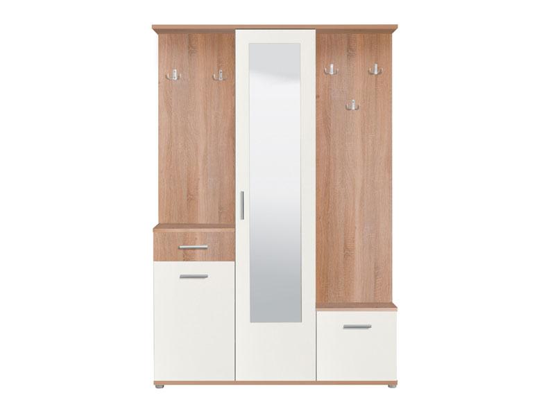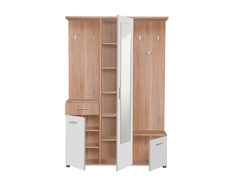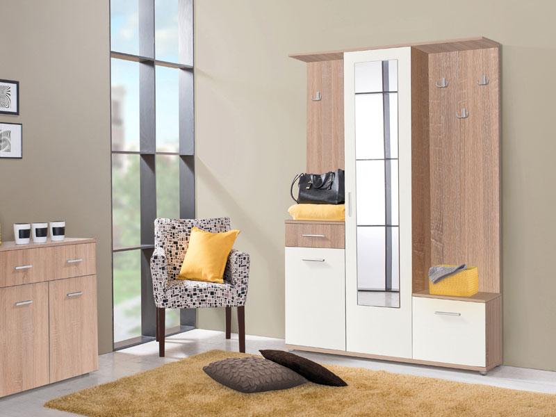 Predsoblje - u sonoma hrast i opak bijelom dezenu, učint će da prvi suret sa vašim domom bude efektan i prijatan. Ovaj model posjeduje skladno organizovan upotrebni prostor za odlaganje sezonske garderobe i obuće tako da ćete postići funkcionalno organizovan prostor, dok centralno pozicionirano ogledalo donosi osećaj prostranosti.