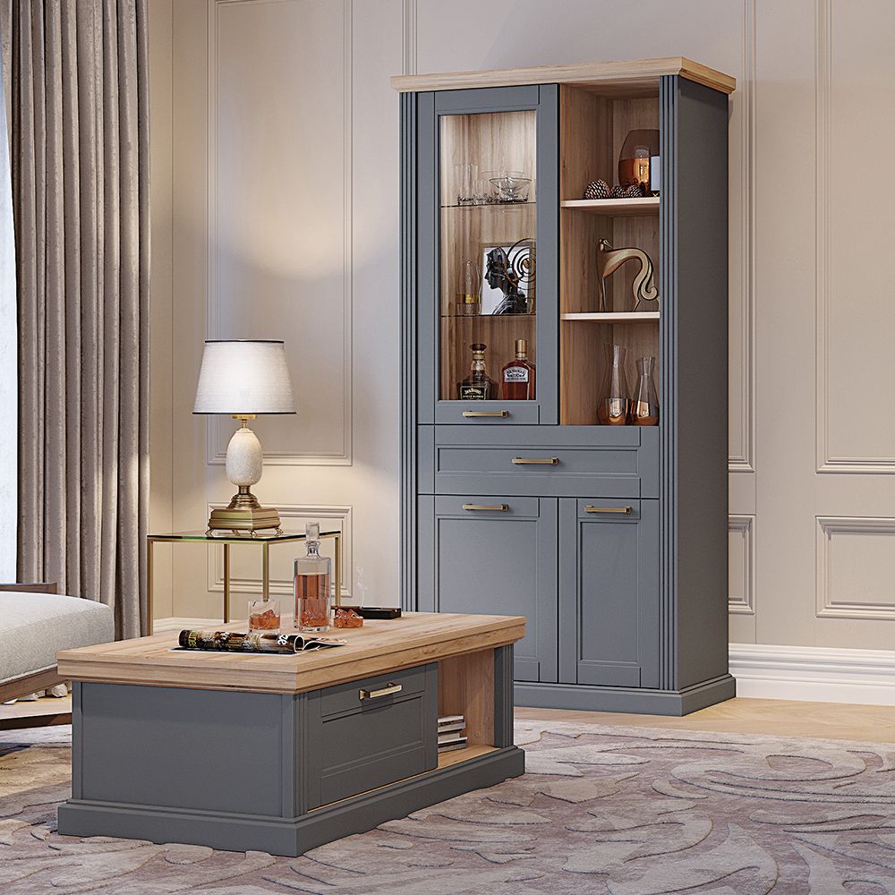 Luksuzna vitrina iz kolekcije TARA sa tri krila, fiokom i otvorenim policama.