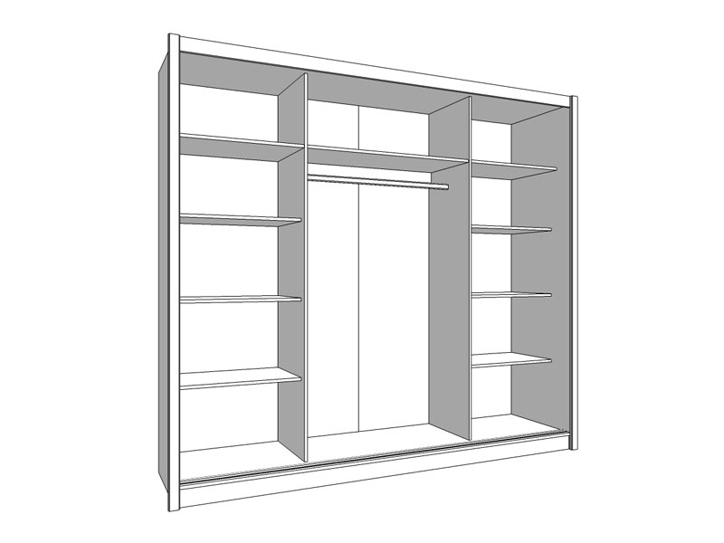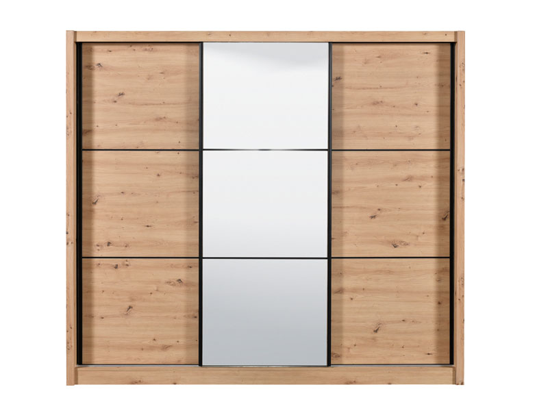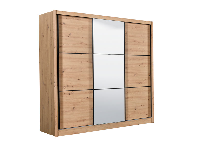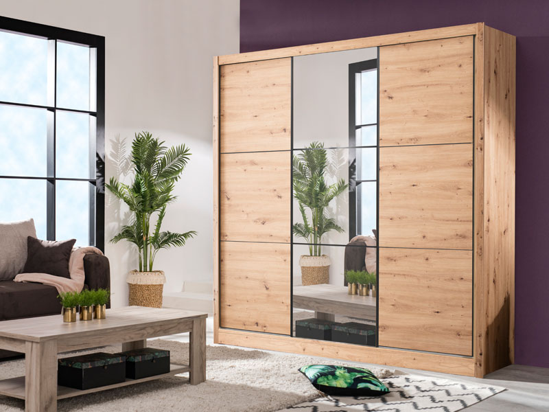 Garderober u dezenu artisan hrasta je moderno dizajnirano i praktično rješenje za odlaganje. Unutrašnjost se sastoji od segmenta sa policama u lijevom i desnom dijelu, kao i segmenta sa garderobnom šipkom u središnjem dijelu. Poseban benefit ovog modela je klizni mehanizam koji doprinosi ekonomičnoj organizaciji raspoloživog prostora, kao i ogledala smještenog na centralnom dijelu garderobera.