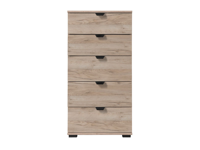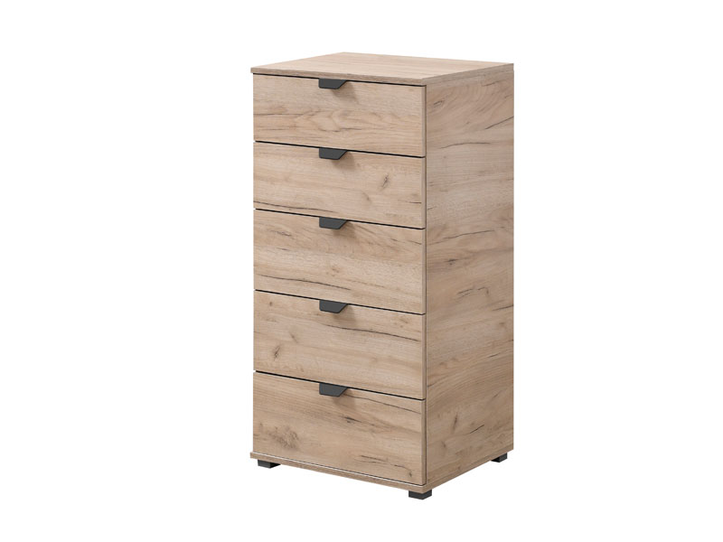 Komoda u dekoru sivog hrasta dizajnirana tako da po svojim dimenzijama širine, od 45 cm, ne zauzima mnogo prostora, a zahvaljujući upotrebnom prostoru koji obezbjeđuje pet fioka, spada u elemente sa velikom upotrebnom vrijednošću. Komoda je pogodna za opremanje predsoblja, dnevne zone ili spavaće sobe.
