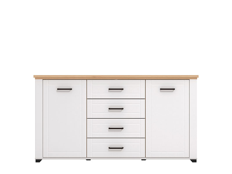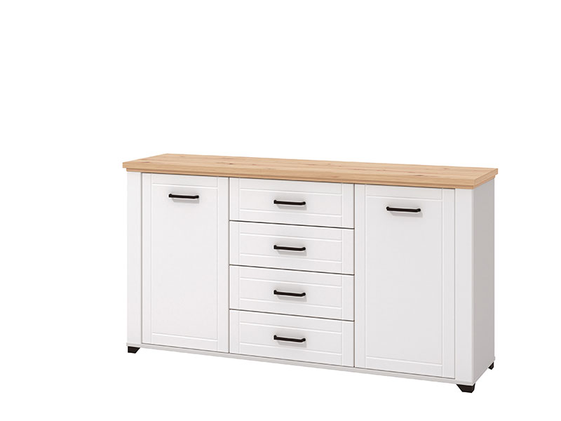 Komoda u kombinaciji dekora artisan hrasta, opak bijele i bijele mat folije, je dizajnerski privlačno rješenje za uređenje dnevnog boravka, koje daje topliju estetiku interijeru. Upotrebni prostor čine praktične fioke u središnjem dijelu i dva zatvorena dijela, koji posjeduju praktično raspoređene police za odlaganje. Frontovi su obogaćeni crnim ručicama jednostavnog dizajna, a koje su usklađene sa dizajnerskom linijom cijele kolekcije.