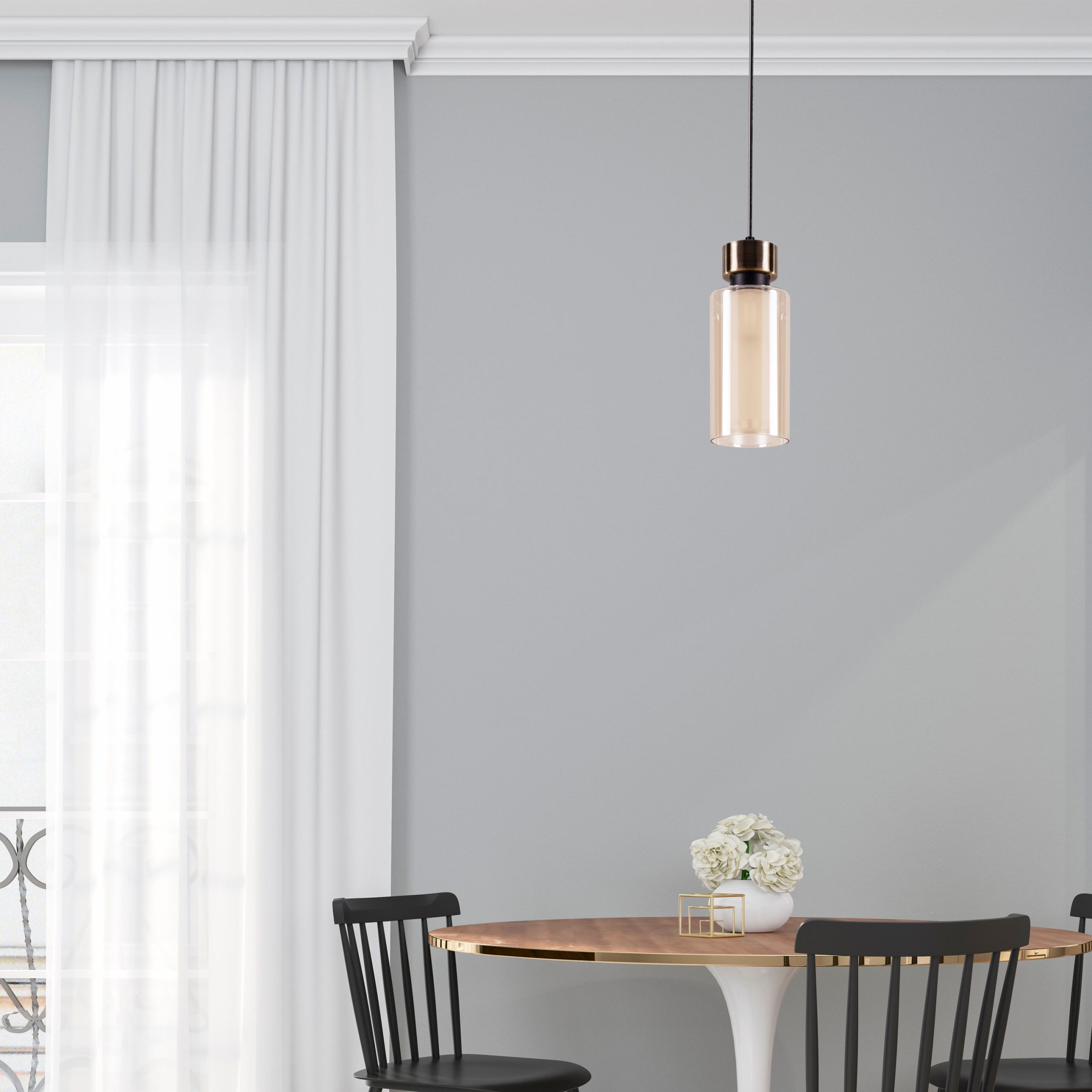 Boja crna+saten zlatna Materijal aluminijum+staklo Sijalica 1xE14 40W max Ulazni napon 220-240V Dimenzije 98x98mm Dimenzije stakla 150x80mm Dužina visećih dijelova 700mm
