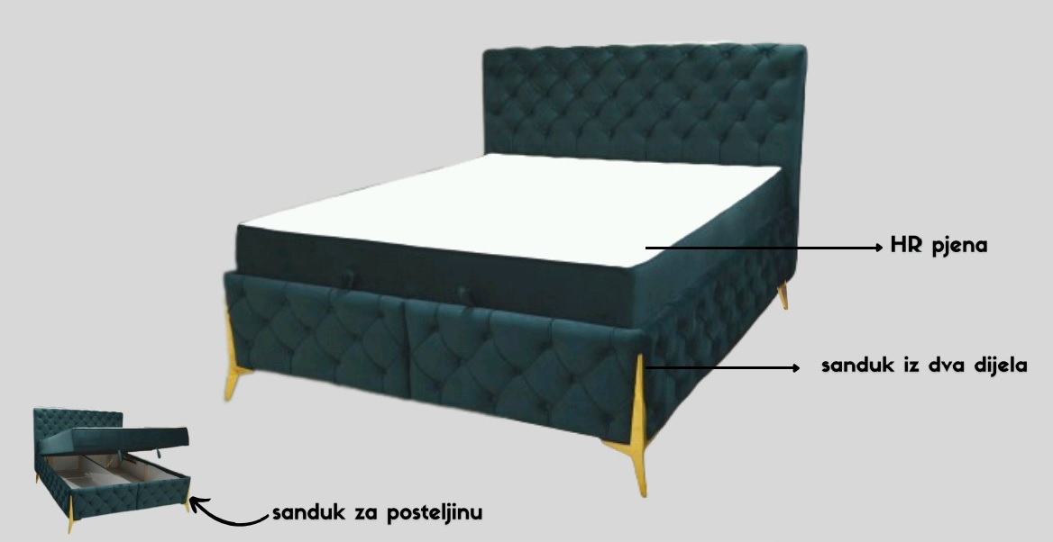 Dimenzija: 160x200 MOGUĆNOST KUPOVINE PO ŠTOF KARTI PROIZVOĐAČA! *Uz ležaj se isporučuje madrac. Posjeduje sanduk za odlaganje stvari.