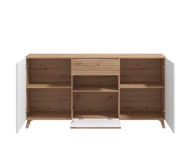 Komoda je izrađena u kombinaciji dekora artisan hrasta sa segmentima u dekoru bijele lak folije, kao i artisan hrast folije, koji unose osvježavajuću estetiku u ambijent. Drvene ručice povezuju dekore u jednu estetsku cijelinu, dok visoki nogari ističu njihovu eleganciju. Odlično raspoređen upotrebni prostor čine jedna praktična fioka, tri zatvorena dijela i otvorena polica.