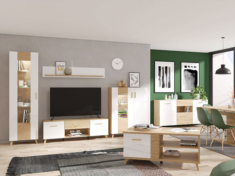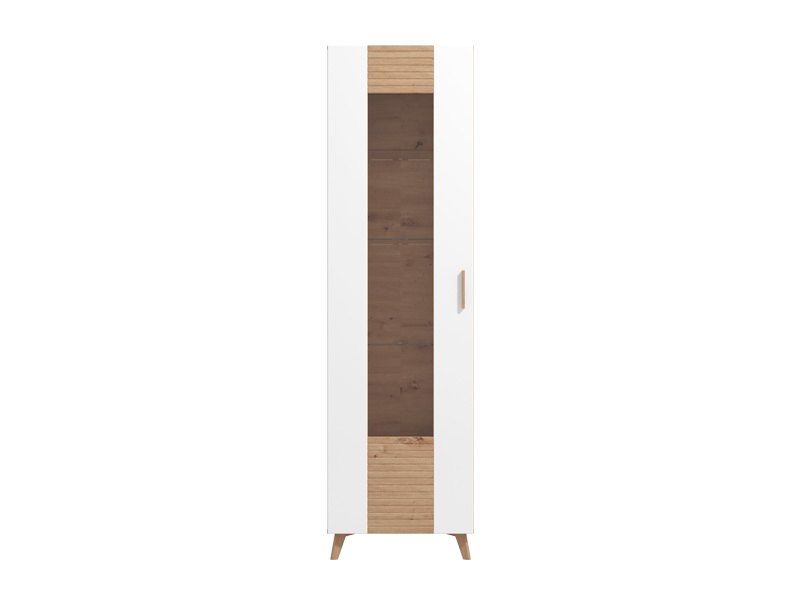 Vitrina je izrađena u kombinaciji dekora artisan hrasta sa segmentima u dekoru bijele lak folije, kao i artisan hrast folije, koji unose osvježavajuću estetiku u ambijent. Drvene ručice povezuju dekore u jednu estetsku cijelinu, dok visoki nogari ističu njihovu eleganciju. Funkcionalnosti ovog elementa doprinosi praktično raspoređen upotrebni prostor. Postoji mogućnost dodavanja rasvjete.