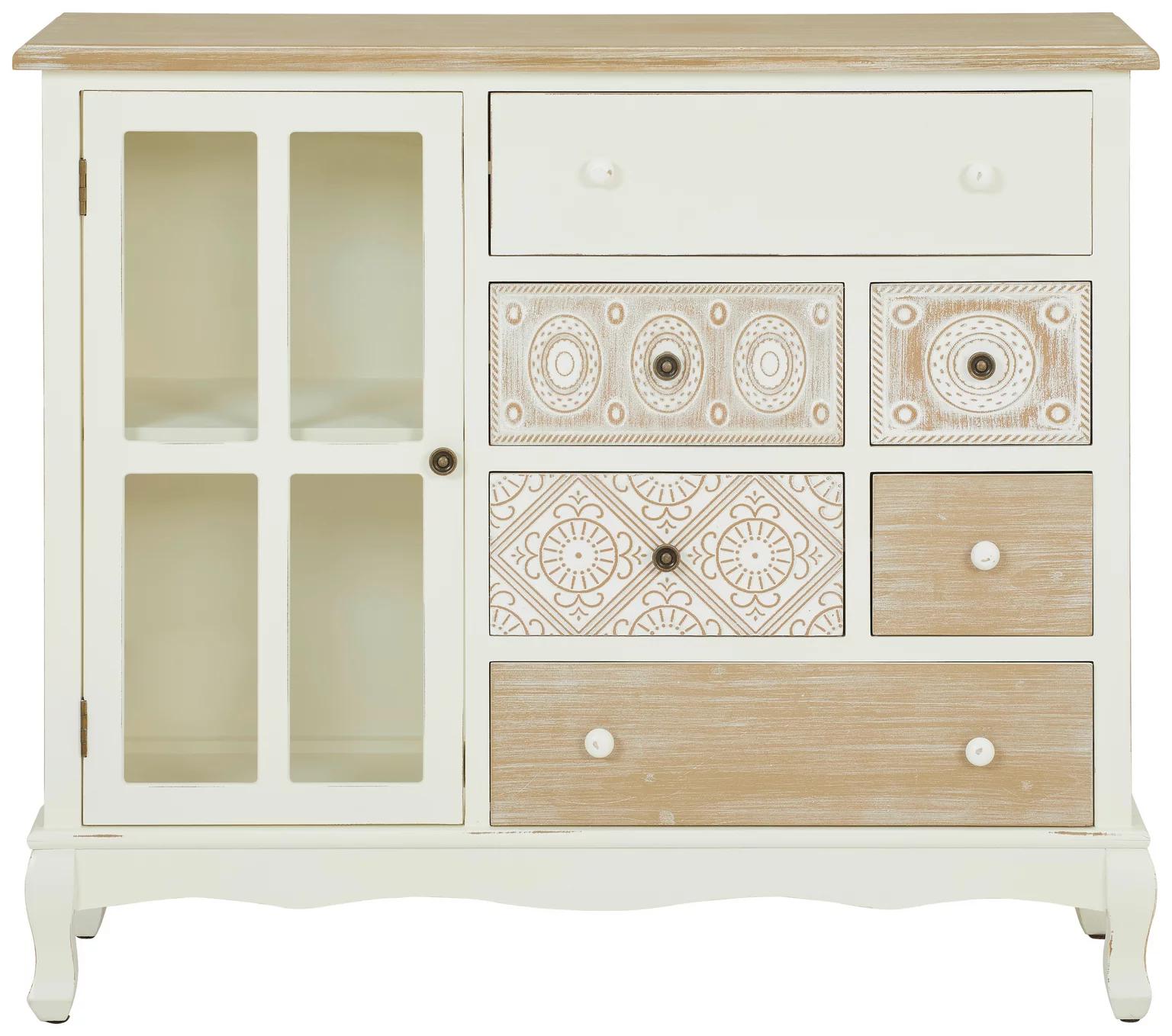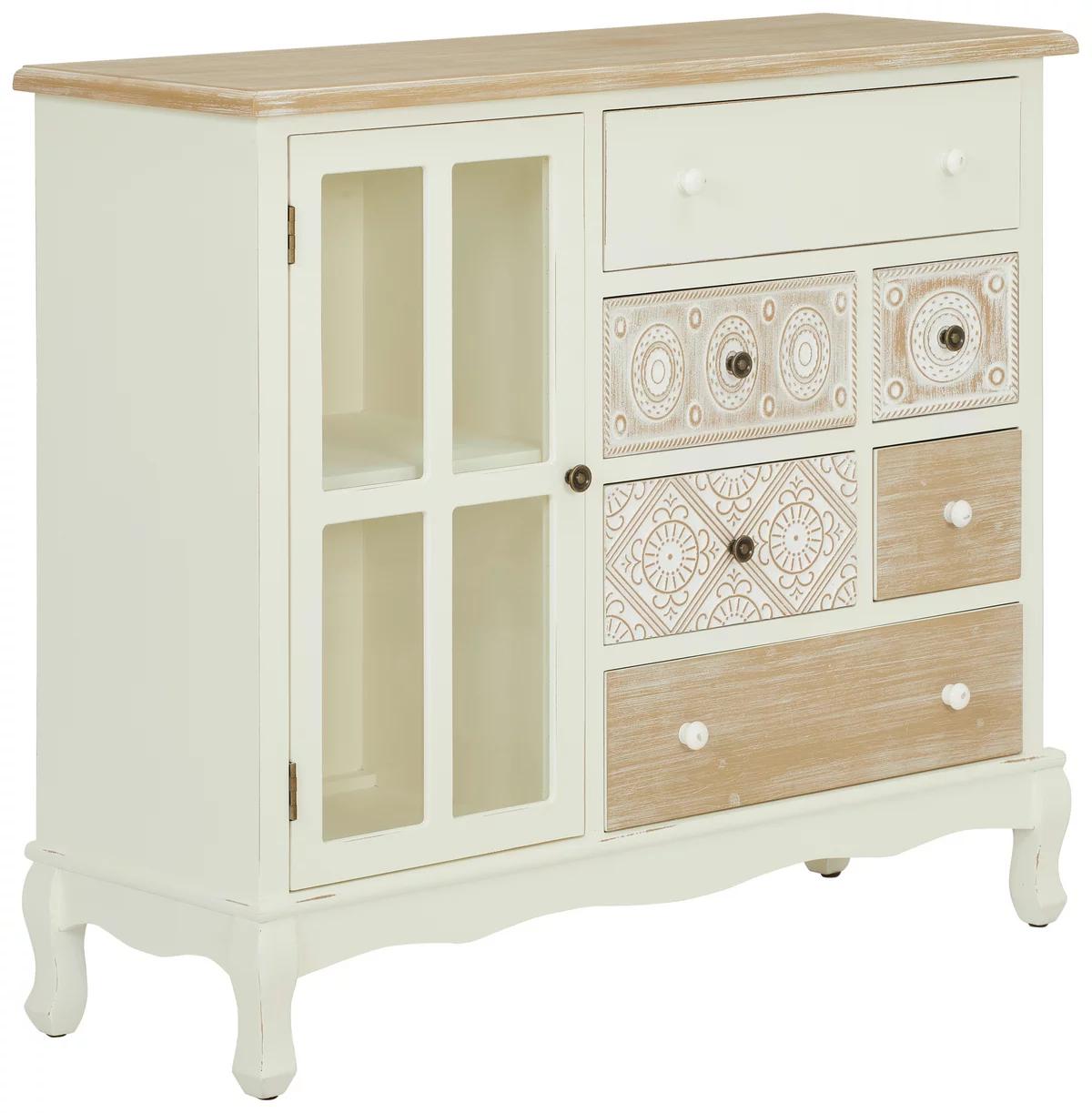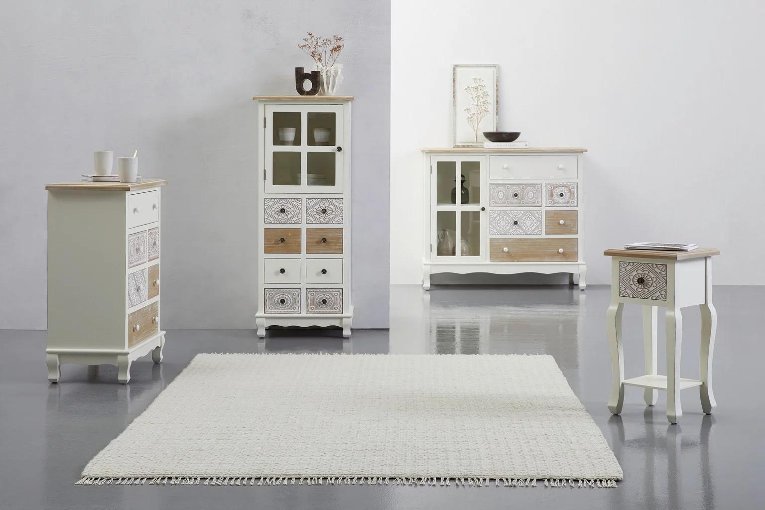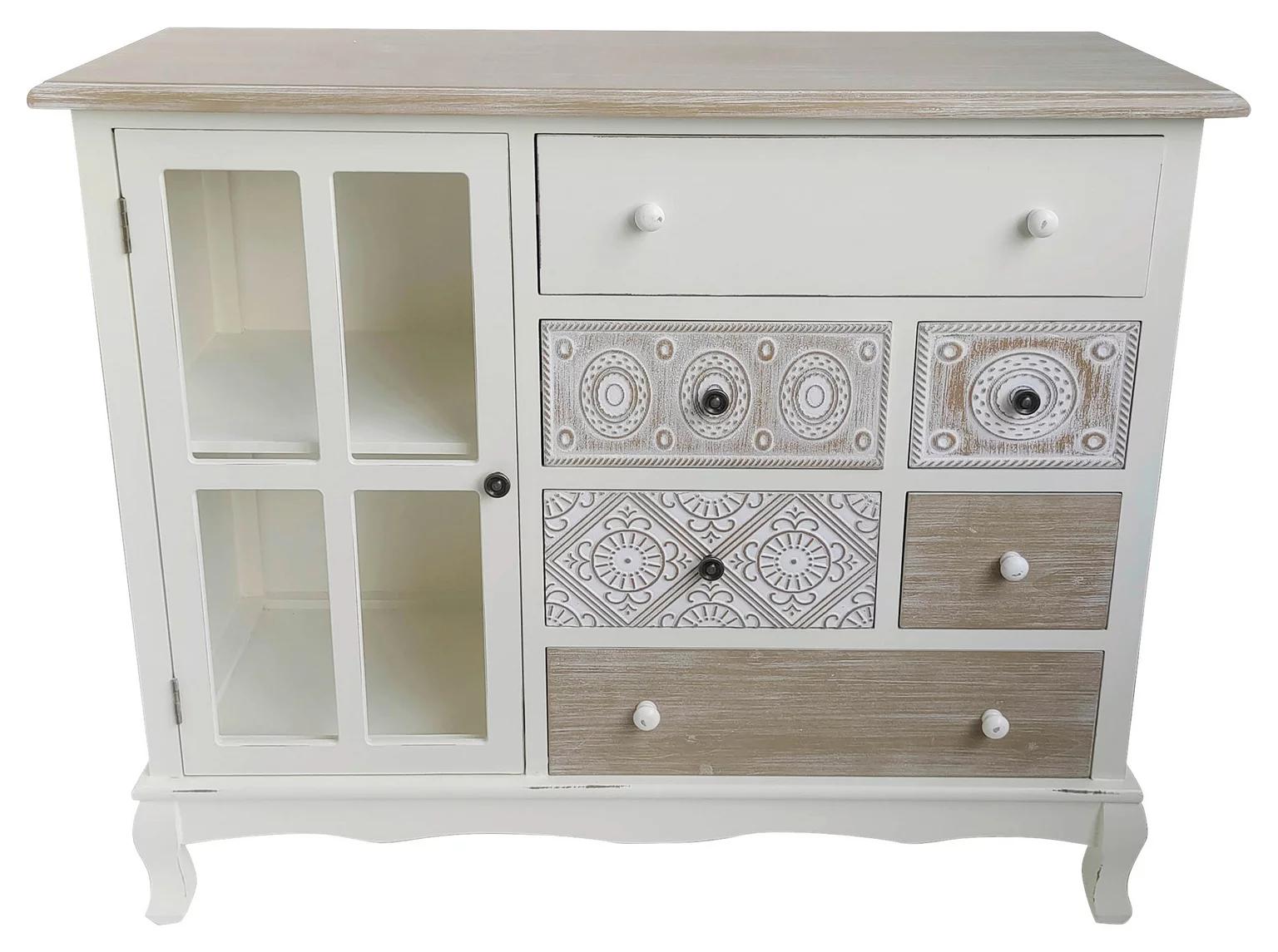U kombinaciji bijele i prirodne boje, ova komoda blista u vintage stilu, s blago etno elementima koji daju poseban šarm.