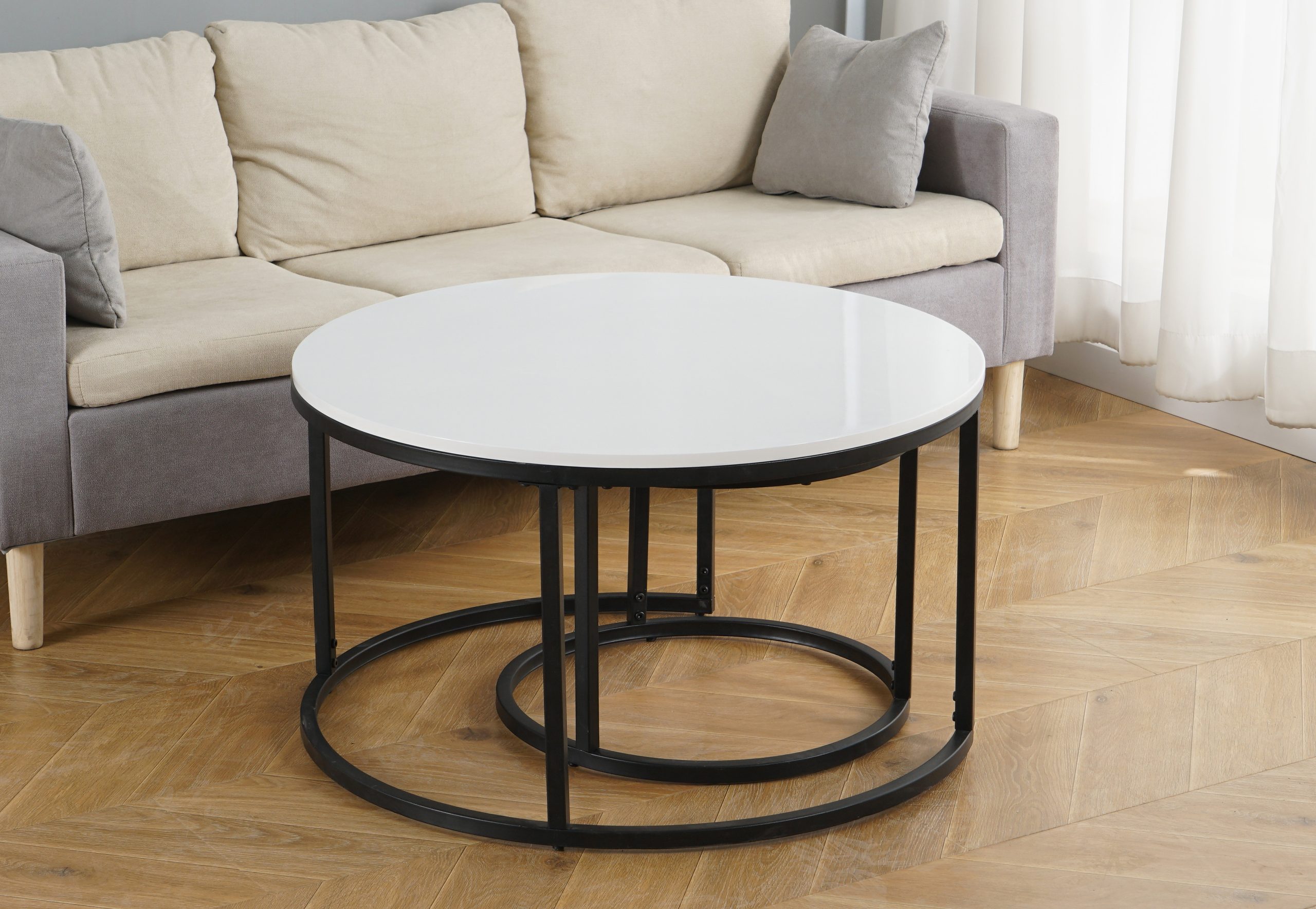 Boja: bijeli mdf / visoki sjaj Dimenzije većeg: 80×45,5cm Dimenzije manjeg: 50x39cm Prodaju se u setu dva stolića!