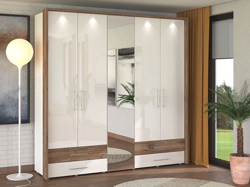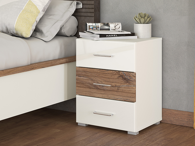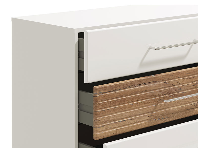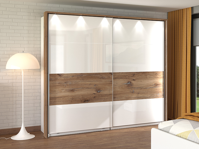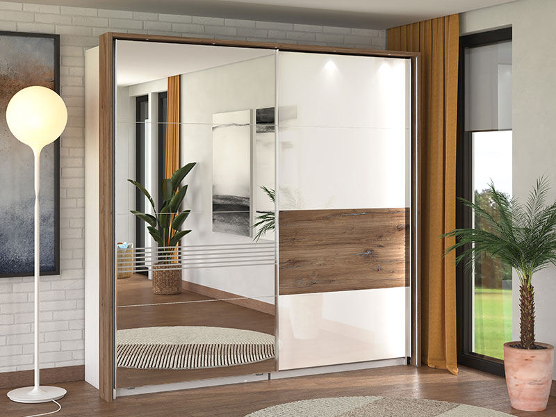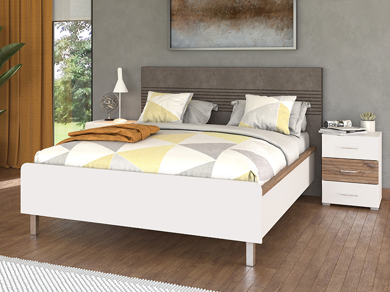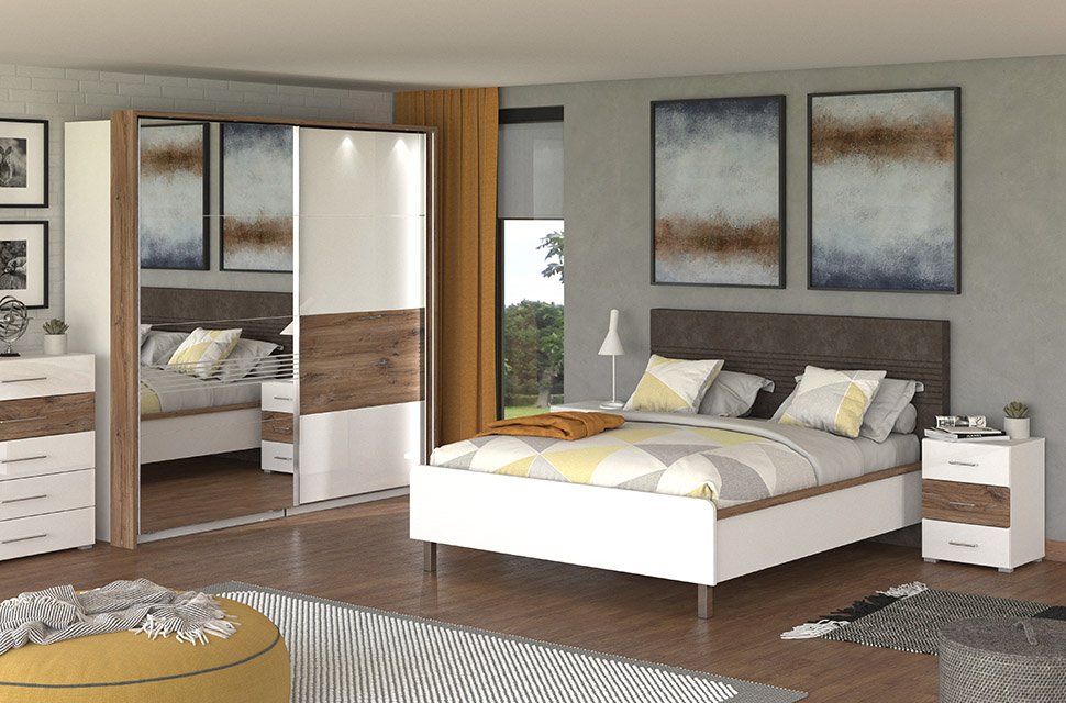 Spavaću sobu karakteriše smjeli spoj kontrastnih dekora, i to: opak belog dekora, dekora flagstaf hrasta, bele lak folije i flagstaf hrast folije, koji doprinosi balansu rustike i elegancije u čitavom ambijentu. U osnovi ovog konceptualnog rešenja za opremanje ambijenta spavaće sobe je jednostavan dizajn sa autentičim detaljima koji su uvedeni kao manji segmenati sa flagstaf folijom, a poseduju i diskretne rukohvate, tapacirano uzglavlje i bele, elegantne, stopice na bračnom krevetu 160. Spavaću sobu čini sedam funkcionalnih elemenata: bračni krevet 160, ormar 4K3F2O, garderober 245, garderober 220 OG, ormar 5K4F0 ,noćni ormarić NO3F, kao i komoda 5F.